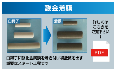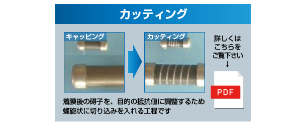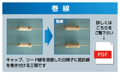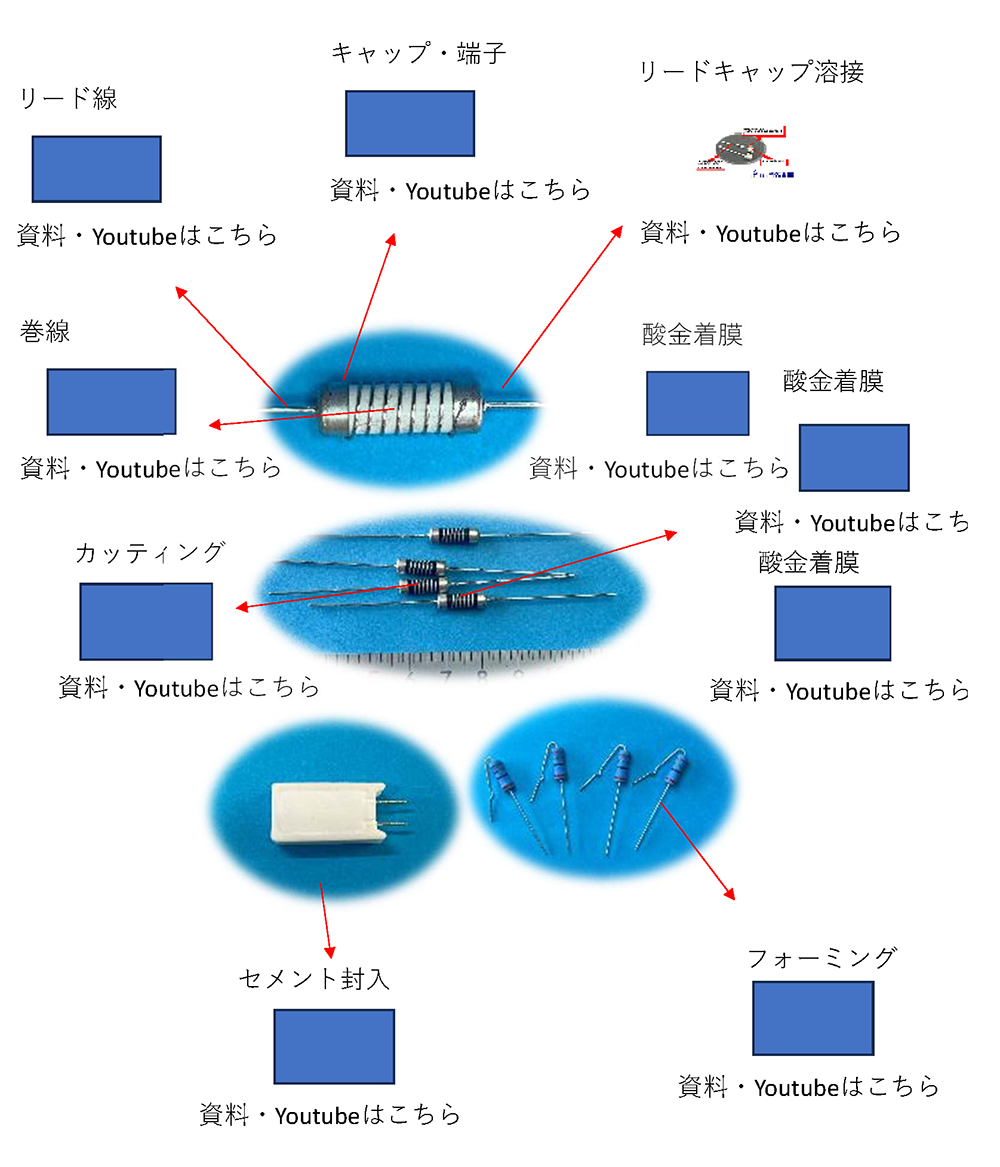 抵抗器製造を支える部分素材、工程を図説、動画にてご紹介いたします。これらの組み合わせで様々な抵抗器を製造いたします。また、完成品のみならず各素材の販売仲介、部分工程の請負、特殊な組み合わせの抵抗器製造も承っております。